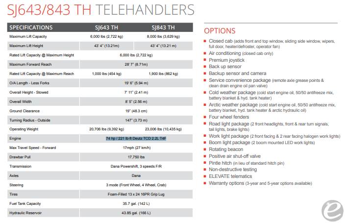 Equipment Description: New SkyJack SJ643 TH Telehandler withlb Capacity Less de-rate 43 4 of max lift height 28 7 max forward reach 74 hp lb-ft Deutz TCD 2 2L T4F with 3-Speed Dana powershift transmission Dana axles 3 Mode steering 48 Quick attach with floating pin carriage Quick attach carriage mount Suspension seat grip lug pneumatic tires plus a beautiful finish STOCK PHOTOS