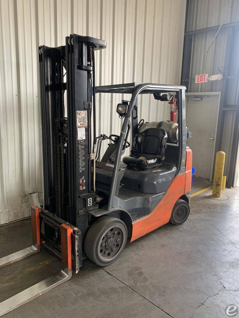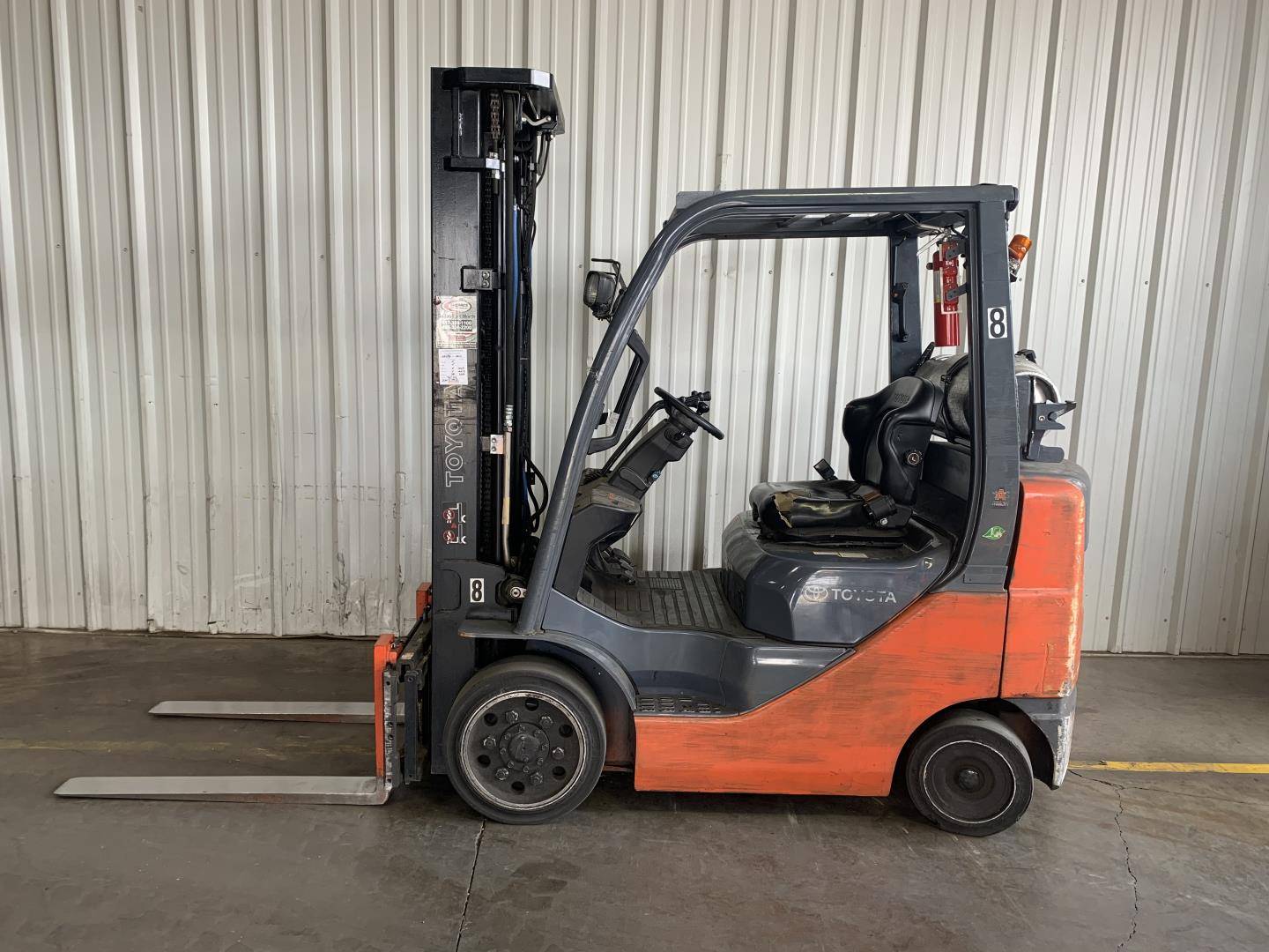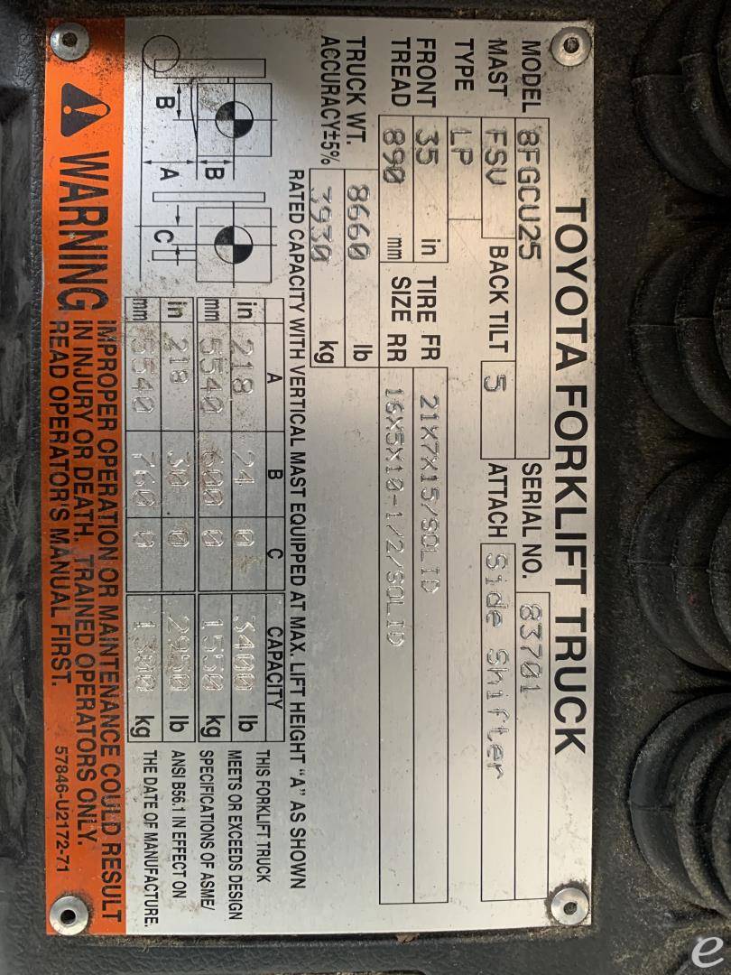 Equipment Description: Manufacturer Toyota Model Number 8FGCU25 General Specifications Power Type LPG Liquid Petroleum Gas Operator Position Sit-down Tire Type Cushion Number of Wheels 4 Dimensions Length to Face of Forks ft Overall Width Without Load 3 5 ft Height to Top of Overhead Guard 7 ft Turning Radius in Minimum Outside Turning Radius 5 5 ft Wheelbase ft Performance Rated Load Capacity lbs Load Center 24 in Travel Speed Loaded mph Travel Speed Unloaded mph Lifting Speed Loaded ft min Lifting Speed Unloaded ft min Lowering Speed Loaded 98 ft min Lowering Speed Unloaded 98 ft min Engine Specifications Engine Model Toyota 4Y Engine Type 4-cylinder water-cooled Displacement in Rated Power 51 hp RPM Torque 6 lbf ft RPM Weights Service Weight lbs Axle Loading Front lbs With Load Axle Loading Rear lbs With Load Wheel Specifications Front Tires 21x7x15 Rear Tires 16x5x10 Tread Front Rear 36 36 in Transmission Transmission Type Powershift Number of Speeds Forward Reverse 1 1 Brakes Service Brake Hydraulic Parking Brake Mechanical hand operated