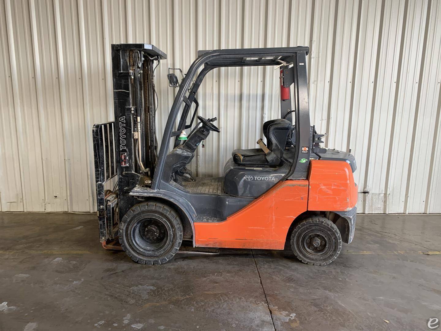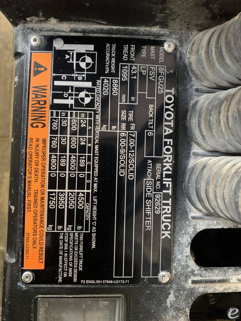 Equipment Description: General Information Model 8FGU25 Manufacturer Toyota Type Forklift Engine Engine Type Internal Combustion Fuel Type LPG Gasoline Engine Model Toyota 4Y Dimensions Overall Length approximatelyinches Overall Width approximately 45 inches Overall Height to top of overhead guard approximately 83 inches Wheelbase around 59 inches Weights Weight approximatelylbs Performance Load Capacity lbs Travel Speed unloaded approximately 11 mph Turning Radius approximately 87 inches Tires Tire Type Pneumatic Front Tires 7 00-12-12PR Rear Tires 6 00-9-10PR Brakes Service Brake Hydraulic Parking Brake Mechanical Lever Hydraulic System Auxiliary Hydraulic Flow varies Attachments Fork Length varies