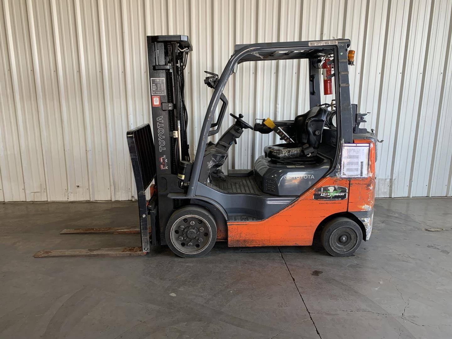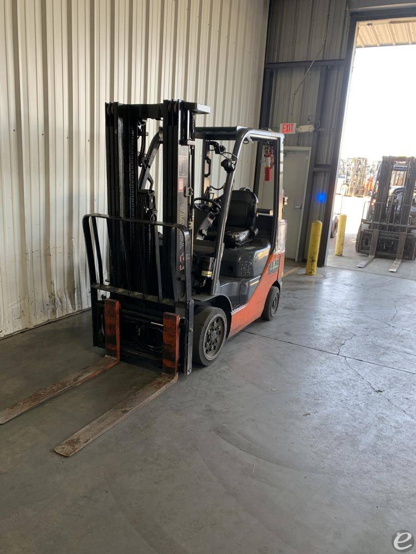 Equipment Description: Manufacturer Toyota Model Number 8FGCU25 General Specifications Power Type LPG Liquid Petroleum Gas Operator Position Sit-down Tire Type Cushion Number of Wheels 4 Dimensions Length to Face of Forks ft Overall Width Without Load 3 5 ft Height to Top of Overhead Guard 7 ft Turning Radius in Minimum Outside Turning Radius 5 5 ft Wheelbase ft Performance Rated Load Capacity lbs Load Center 24 in Travel Speed Loaded mph Travel Speed Unloaded mph Lifting Speed Loaded ft min Lifting Speed Unloaded ft min Lowering Speed Loaded 98 ft min Lowering Speed Unloaded 98 ft min Engine Specifications Engine Model Toyota 4Y Engine Type 4-cylinder water-cooled Displacement in Rated Power 51 hp RPM Torque 6 lbf ft RPM Weights Service Weight lbs Axle Loading Front lbs With Load Axle Loading Rear lbs With Load Wheel Specifications Front Tires 21x7x15 Rear Tires 16x5x10 Tread Front Rear 36 36 in Transmission Transmission Type Powershift Number of Speeds Forward Reverse 1 1 Brakes Service Brake Hydraulic Parking Brake Mechanical hand operated