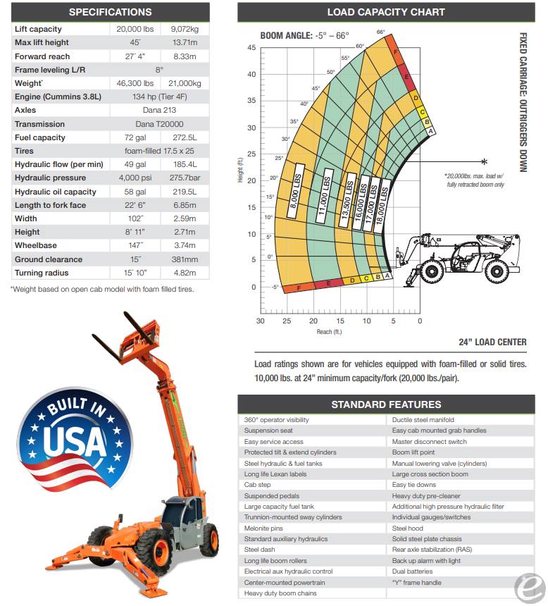 Equipment Description: New Xtreme XR2045-C Telehandler withlb Capacity Less de-rate 45 of max lift height 27 4 of max forward reach Cummins 3 8L Diesel engine -hp T4f Danaaxles Dana T20000 transmission 72gal Fuel tank foam filled tires suspension seat plus a beautiful finish STOCK PHOTOS OTHER OPTIONS AVAILABLE