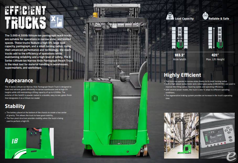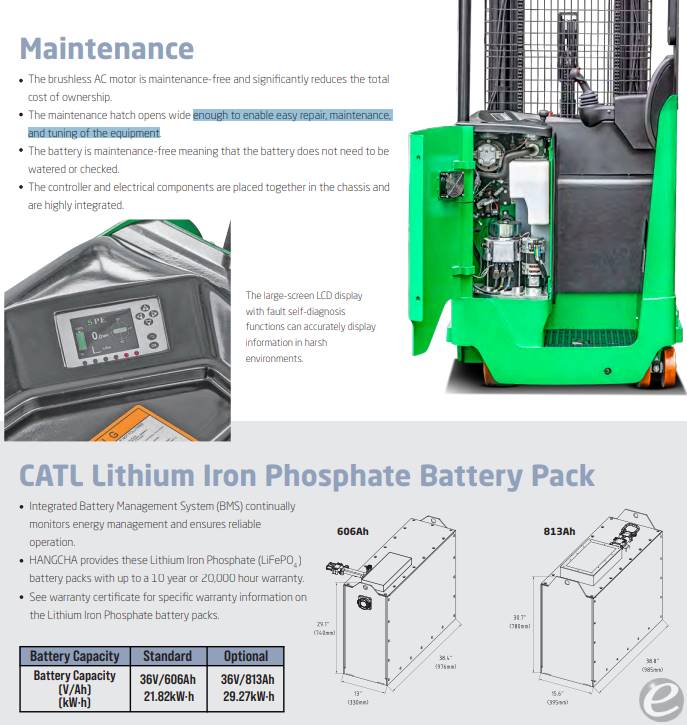 Equipment Description: New Hangcha SR20Li 4 5K Electric Narrow Aisle Single Reach forklift with the innovative Lithium-ion battery polyurethane tires 240 triple stage mast other size available side-shift carriage LED work lights 37 carriage w LBR 42 standard forks emergency shutoff switch automatic deceleration on corners a 36volt li-ion battery with charger included and a beautiful finish STOCK PHOTOS OTHER CAPACITIES OPTIONS AVAILABLE